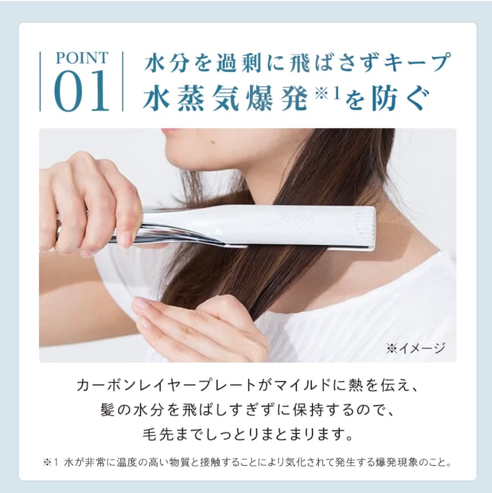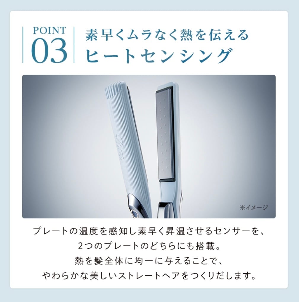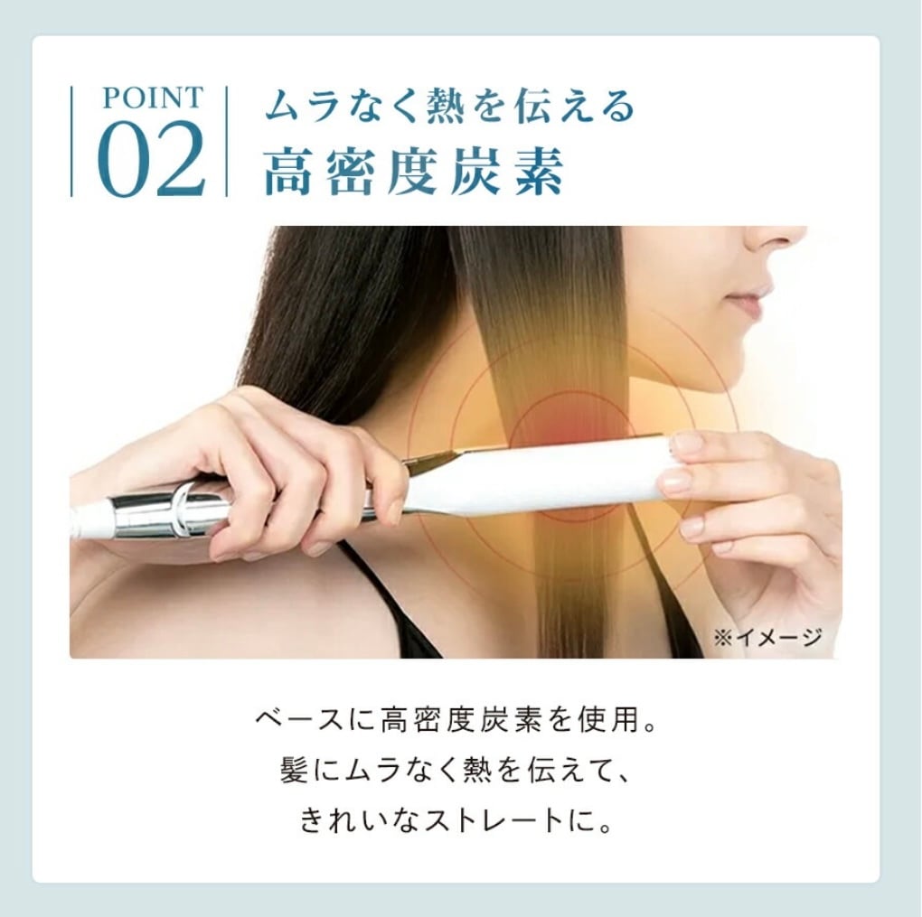 髪の毛に均一に熱を伝える独自の技術で髪の毛のダメージを抑えつつ、高密度炭素・ヒーター・低反発コートの3層が美しく髪を整えます。